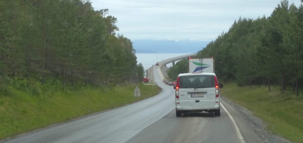 Sice bylo po sedmý večer, ale my jsme jeli ještě dál. Sjeli jsme zpátky Trolí cestu, zastavili se ještě prohlédnout Trolí kemp a frčeli jsme směr první trajekt. Nechtělo se nám ty fjordy objíždět. To není na chvilku. Ono se to nezdá, ale tady je šíleně všechno daleko. Trajekt jel jen půl hodinky a my zůstali v autě.